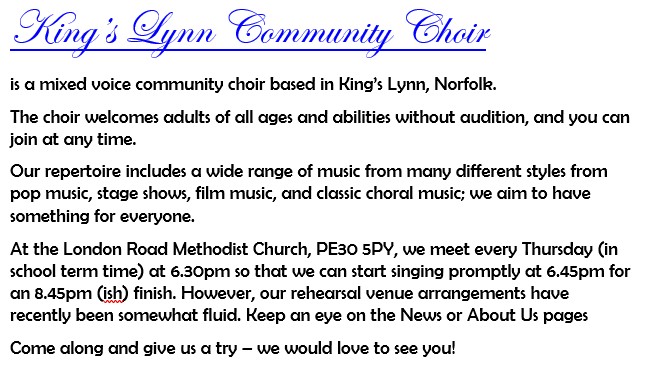 If you are interested in joining the choir, or would just like to find out more, please contact either our Musical Director, or our Music Secretary as below.